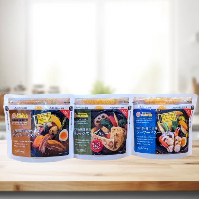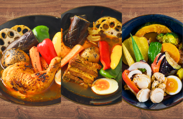 鶏レッグスープカレー骨付き鶏もも肉(アメリカ産)、比内地鶏ガラだし、カレーペースト、フルーツチャツネ、ガラムマサラ、コリアンダー、クミン、カルダモン、シナモン、ナツメグ、チリペッパー、ペッパー、ターメリック、ジンジャー、チキンパウダー、オイスターソース、ガーリック、(一部に鶏肉を含む)桃豚角煮スープカレー豚バラ肉(国産)、比内地鶏ガラだし、カレーペースト、フルーツチャツネ、ガラムマサラ、コリアンダー、クミン、カルダモン、シナモン、ナツメグ、チリペッパー、ペッパー、ターメリック、ジンジャー、チキンパウダー、オイスターソース、ガーリック、(一部に鶏肉・豚肉を含む)シーフードスープカレーほたて貝(国産)、赤いか、あさり、ずわいがに、比内地鶏ガラだし、カレーペースト、フルーツチャツネ、ガラムマサラ、コリアンダー、クミン、カルダモン、シナモン、ナツメグ、チリペッパー、ペッパー、ターメリック、ジンジャー、チキンパウダー、オイスターソース、ガーリック、(一部に鶏肉・かに・いかを含む)