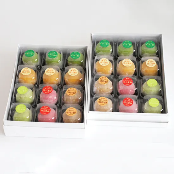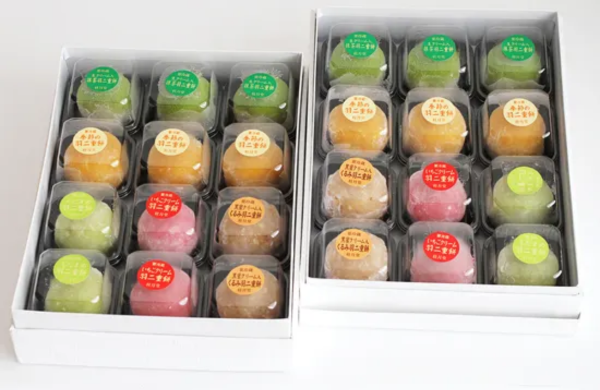 〇いちごクリーム羽二重餅原材料名:砂糖(国内製造)、餅米、白餡、水飴、クリーム、苺、加糖練乳/トレハロース、乳化剤、香料、PH調整剤、増粘多糖類、着色料(赤3、赤106)(原材料の一部に小麦、卵、乳成分を含む)〇生クリーム入り抹茶羽二重餅原材料名:砂糖(国内製造)、餅米、白餡、水飴、クリーム、抹茶/トレハロース、乳化剤、香料、PH調整剤、増粘多糖類(原材料の一部に小麦、卵、乳成分を含む)〇えだまめ羽二重餅原材料名:砂糖(国内製造)、餅米、白餡、枝豆、水飴、クリーム、寒天、食塩/トレハロース、乳化剤、香料、PH調整剤、増粘多糖類、着色料(黄4、黄5、青1)(原材料の一部に小麦、卵、乳成分、大豆を含む)〇黒蜜クリーム入りくるみ羽二重餅原材料名:砂糖(国内製造)、餅米、白餡、水飴、クリーム、胡桃、黒砂糖、寒天/トレハロース、乳化剤、香料、PH調整剤、増粘多糖類(原材料の一部に小麦、卵、乳成分、大豆を含む)〇ティラミス羽二重餅(季節の羽二重餅)目安時期:1月~5月末ぐらい原材料名:砂糖(国内製造)、餅米、白餡、水飴、ナチュラルチーズ、クリーム、卵黄、コーヒー豆、ココアパウダー/トレハロース、乳化剤、香料、PH調整剤、増粘多糖類(原材料の一部に小麦、卵、乳成分を含む)〇マンゴークリーム羽二重餅(季節の羽二重餅)目安時期:6月~9月末ぐらい原材料名:砂糖(国内製造)、餅米、白餡、水飴、クリーム、マンゴー、ココナッツミルク、寒天、コーンスターチ/トレハロース、乳化剤、香料、PH調整剤、増粘多糖類(原材料の一部に小麦、卵、乳成分を含む)〇ブルーベリー羽二重餅(季節の羽二重餅)目安時期:6月~9月末ぐらい原材料名:砂糖(国内製造)、餅米、白餡、水飴、クリーム、ブルーベリー、寒天、コーンスターチ/トレハロース、乳化剤、香料、PH調整剤、増粘多糖類(原材料の一部に小麦、卵、乳成分を含む)〇かぼちゃ羽二重餅(季節の羽二重餅)目安時期:10月~12月末ぐらい原材料名:砂糖(国内製造)、餅米、白餡、水飴、クリーム、南瓜、寒天、食塩/トレハロース、乳化剤、香料、PH調整剤、増粘多糖類(原材料の一部に小麦、卵、乳成分を含む)